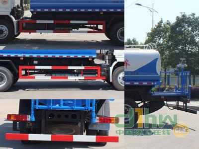 該車主要用于城市灑水、壓塵。主要裝置為水罐及泵。運輸介質(zhì):水,密度:1000千克/立方米,罐體有效容積9.66立方米.罐體外形尺寸(長度×長軸×短軸)(mm): 5000×2200×1310,可選裝風(fēng)機。側(cè)、后防護均用螺栓連接,側(cè), 后防護材料為Q235B,后部防護裝置斷面尺寸(寬×高)50×120 (mm),后部防護離地高度:480mm.隨底盤選裝駕駛室,后部可選裝風(fēng)機裝置。罐體顏色可變化,文字噴涂位置可變化。ABS型號為ABS-E 4S/4M,生產(chǎn)廠家為威伯科汽車控制系統(tǒng)(中國)有限公司。