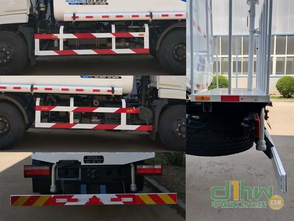 罐體尺寸mm(長×長軸×短軸):3300×1600×1100,罐體有效容積3.9立方米。側(cè)后防護裝置材質(zhì)為Q235,與車體螺栓聯(lián)接,后防護截面尺寸為35mm×100mm,離地高度為380mm。