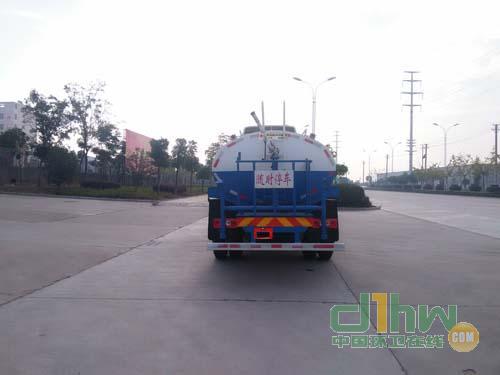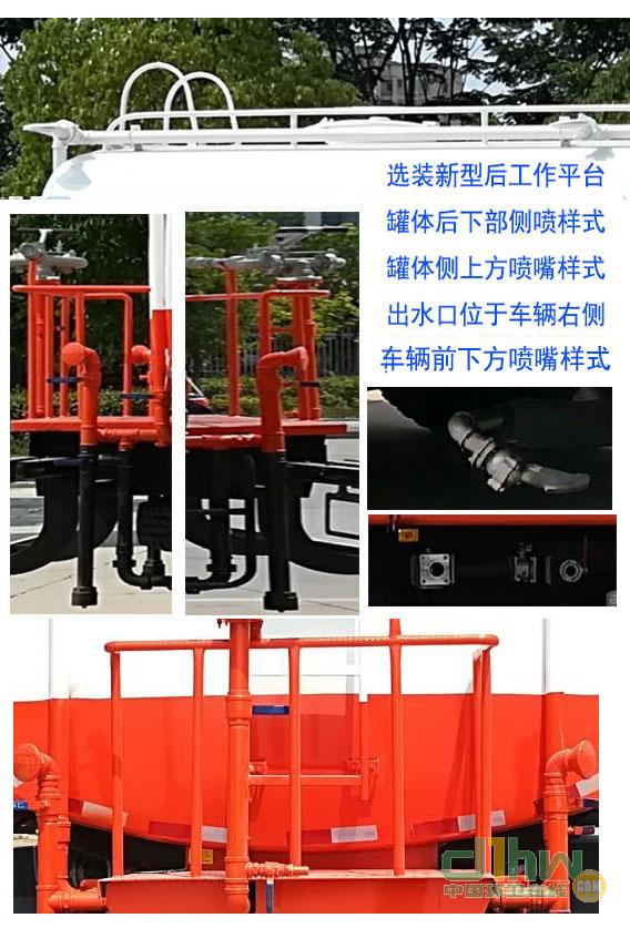 灑水車前沖(噴)后灑,帶側(cè)噴,罐體后帶工作平臺(tái),平臺(tái)上安裝綠化灑水炮,灑水炮可全方位旋轉(zhuǎn),可連續(xù)調(diào)成直沖狀、大雨、小雨、毛毛雨,帶安全護(hù)欄,配備全國(guó)質(zhì)量評(píng)比第一名的杭州威龍大功率專用灑水泵,泵可自吸自排,安裝過濾網(wǎng),帶消防接口,可通過消防栓進(jìn)水,帶自流閥,隨車選裝20米綠化卷盤,可噴灑農(nóng)藥,罐體金屬漆。