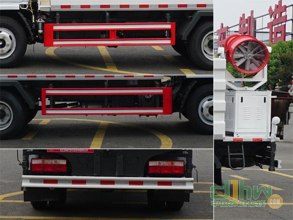 該車型是裝配專用裝置為噴灑裝置,儲液箱等,主要用于鐵,道路,自卸車,城市廣場,散裝物料堆等各種場所除塵.整車長/后懸/軸距對應(yīng)關(guān)系為(mm):5950/1602/3308,5450/1610/2800.側(cè)防護(hù)材料為Q235,連接方式為連接支架固焊在付車架大梁上.后防護(hù)材料為Q235,連接方式:用結(jié)構(gòu)連接件固焊在主車后端,后部防護(hù)裝置斷面尺寸(寬×高)40×120(mm),后部防護(hù)離地高度:420(mm).選裝新造型前面罩和前組合燈具,前霧燈為選裝件.ABS廠家及型號:襄陽東風(fēng)隆誠機械有限責(zé)任公司/ABS/ASR-24V-4S/4M.