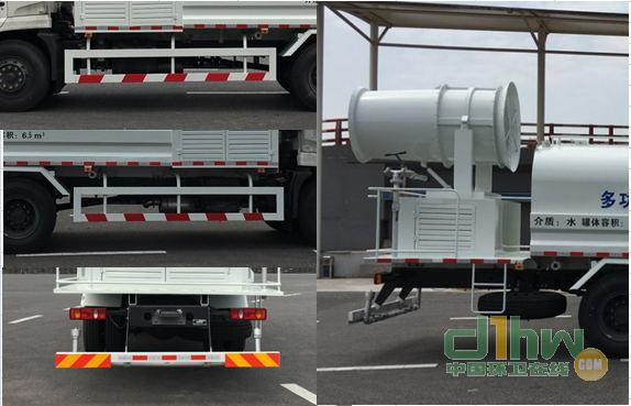 該車僅選用5000mm軸距底盤,運輸介質(zhì):水,密度:1000千克/立方米。整車長/前懸/后懸/后伸(mm)的對應關系為:9980/1430/2950/600。1、選裝WF100型風機對應整備質(zhì)量10500kg ,罐體容積 7.4立方米,罐體外形尺寸(長×寬×高)(mm):3500×2340×1440;2、選裝WF120型風機對應整備質(zhì)量11500kg,罐體容積 6.5立方米,罐體外形尺寸(長×寬×高)(mm):3200×2340×1440;3、車身logo噴圖或粘貼樣式、位置和車輛顏色可變化、選裝前部發(fā)動機保護罩樣式;4、側防護材料為Q235,用螺栓連接;后防護材料為Q235A 100×50矩管,與車架采用螺栓連接,后防護離地高度為470mm,ABS型號:3631010-C2000,4460046440;生產(chǎn)廠家:東科克諾爾商用車制動系統(tǒng)(十堰)有限公司,威伯科汽車控制系統(tǒng)(中國)有限公司.5、該車安裝有具有衛(wèi)星定位的行駛記錄儀。隨底盤選裝駕駛室。