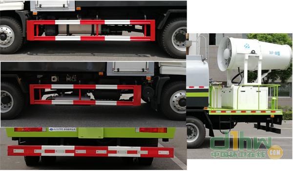 隨底盤(pán)選裝駕駛室,車(chē)輛尾部后伸量為740mm,側(cè)防護(hù)與后防護(hù)所用材料材質(zhì)均為Q235,側(cè)防護(hù)與車(chē)輛采用螺栓連接,后防護(hù)則采用與車(chē)輛焊接連接,后下部防護(hù)裝置的斷面為槽型,斷面尺寸為:150mm×50mm,離地高度為480mm;僅用底盤(pán)軸距為4500mm和4700mm.長(zhǎng)度/軸距對(duì)應(yīng)關(guān)系;9680/4700;9480/4500,改裝,ABS控制器型號(hào)/廠家:CM4XL-4S/4M/廣州瑞立科密汽車(chē)電子股份有限公司,專(zhuān)用裝置有水箱和噴霧機(jī),用于降低空氣中的灰塵,霧霾等現(xiàn)象.