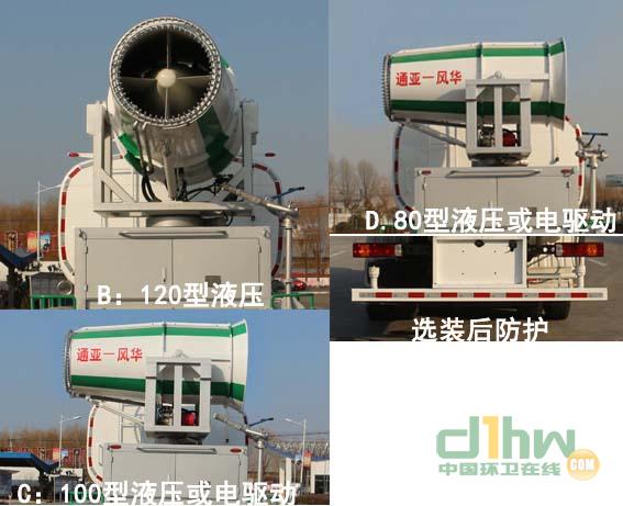 裝備有水泵,噴霧機(jī)等專用裝置,具有灑水、噴霧功能,用于城市大規(guī)模拆遷、建設(shè),煤炭、堆場粉塵,露天煤礦開采,城市PM2.5超標(biāo)等粉塵抑制的專用作業(yè)汽車;僅采用軸距為:4600+1350mm,選裝不同噴霧機(jī),A.120型電驅(qū)動噴霧機(jī)整車長11705mm,后懸3285mm,后伸1040mm,高3890mm,整備質(zhì)量16500kg;B.120型液壓驅(qū)動噴霧機(jī)整車長11150mm,后懸3285mm,后伸485mm,高3890mm,整備質(zhì)量15010kg;C.100型液壓或電驅(qū)動噴霧機(jī)整車長10315mm,后懸2935mm,高3670mm,整備質(zhì)量15380kg;D.80型液壓或電驅(qū)動噴霧機(jī)整車長9725mm,后懸2345mm,高3560mm,整備質(zhì)量15010kg;E.M12型液壓驅(qū)動噴霧機(jī)整車長11705mm,后懸3285mm,高3890mm,后伸1040mm,整備質(zhì)量15010kg;F.M12型電驅(qū)動噴霧機(jī)整車長11705mm,后懸3285mm,后伸1040mm,高3890mm,整備質(zhì)量16500kg,G.M08、M10型噴霧機(jī)整車長10315mm,后懸2935mm,高3670mm,整備質(zhì)量15010mm,噴霧機(jī)廠家/型號:廣東風(fēng)華環(huán)保設(shè)備股份有限公司/(3WD2000-120,3WD2000-100,3WD2000-80),山東華力機(jī)電有限公司/(TDM-M08,TDM-M10,TDM-M12).專用裝置:風(fēng)送式噴霧機(jī).僅采用底盤鋼板彈簧片數(shù)為11/10,3/10,3/4;側(cè)后防護(hù)裝置材料均為:Q235,側(cè)防護(hù)裝置與車架連接方式為:螺栓連接;后防護(hù)裝置與車架連接方式為:焊接,后防護(hù)裝置尺寸為:截面150×65mm,離地高度500mm,選裝后防護(hù)裝置尺寸可為(截面)120×68mm,與車架連接方式為:螺栓連接;ABS系統(tǒng)型號為4460046300,生產(chǎn)企業(yè)為威伯科汽車控制系統(tǒng)(中國)有限公司.