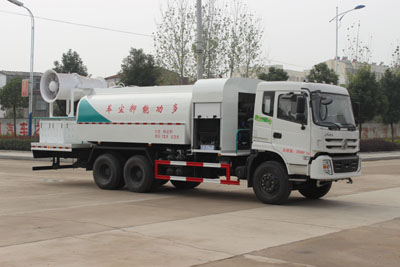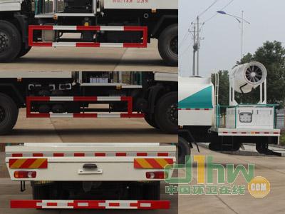 該車(chē)用途為抑塵降霾。主要裝置為水罐、風(fēng)機(jī).1,罐體有效容積為:13.8立方米;運(yùn)輸介質(zhì):抑塵劑;密度:900千克/立方米;罐體外形尺寸(長(zhǎng)×長(zhǎng)軸×短軸)(mm):4500×2420×1650. 2, 整車(chē)長(zhǎng)/前懸/軸距/后懸/后伸(mm)對(duì)應(yīng)關(guān)系為:10400/1515/4750+1300/2835/無(wú), 10400/1250/4750+1300/3100/無(wú), 10400/1450/4750+1300/2900/無(wú), 11200/1515/4750+1300/2835/800, 11200/1250/4750+1300/3100/800, 11200/1450/4750+1300/2900/800, 10400/1515/4350+1300/3235/無(wú), 10400/1250/4350+1300/3500/無(wú), 10400/1450/4350+1300/3300/無(wú), 11200/1515/4350+1300/3235/800, 11200/1250/4350+1300/3500/800, 11200/1450/4350+1300/3300/800側(cè)防護(hù)采用碳鋼/Q235B,螺栓連接。后防護(hù)采用碳鋼/Q235B,焊接,截面高120mm,截面寬60mm,下邊緣離地高450mm。隨底盤(pán)選裝駕駛室和保險(xiǎn)杠. ABS生產(chǎn)廠家: 東科克諾爾商用車(chē)制動(dòng)系統(tǒng)(十堰)有限公司;型號(hào):3631010-C2000.可選裝不同型號(hào)噴霧機(jī),前部選裝靜音箱,后部左側(cè)或右側(cè)選裝噴霧機(jī)控制柜。選裝前部發(fā)動(dòng)機(jī)保護(hù)罩樣式.