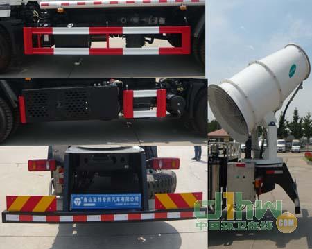 抑塵劑,密度:950千克/立方米,罐體有效容積8.0立方米,罐體長(zhǎng)4330mm,長(zhǎng)軸1965mm,短軸1200mm.防護(hù)裝置材質(zhì)Q235,右側(cè)防護(hù)后部與箱體焊接,其余側(cè)防護(hù)與支撐座螺栓連接,支撐座與副車(chē)架焊接;后部防護(hù)與車(chē)架螺栓連接;后部防護(hù)裝置的斷面尺寸(mm)為:100×80;后防護(hù)離地高度為:520mm.ABS型號(hào):3631010-C2000,4460046440;生產(chǎn)廠家:東科克諾爾商用車(chē)制動(dòng)系統(tǒng)(十堰)有限公司;威伯科汽車(chē)控制系統(tǒng)(中國(guó))有限公司,隨底盤(pán)選裝前臉擾流罩和前霧燈.灑水裝置為選裝;選裝型號(hào)為FCF-60射霧器,對(duì)應(yīng)長(zhǎng)度為9035mm時(shí),后懸為2905mm.可在車(chē)身噴涂或粘貼宣傳文字,標(biāo)識(shí).僅選用后輪距1860mm