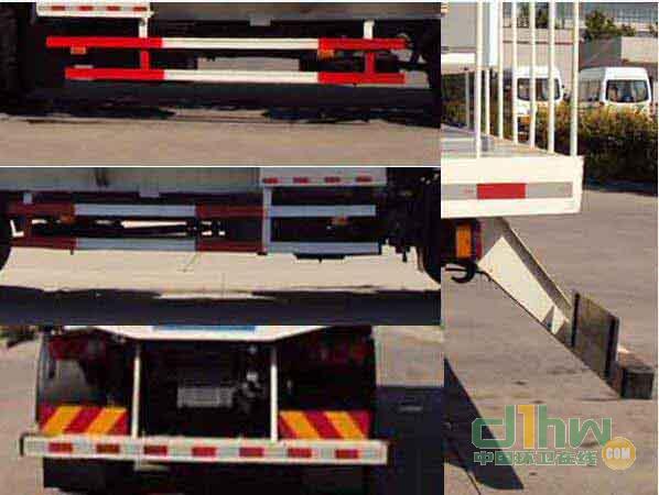 該車側(cè)面,后部均安裝有車身反光標(biāo)識(shí)。側(cè)防護(hù)材料為Q345B,用螺栓連接;后防護(hù)材料為Q235A 100X100方管,與車架采用螺栓連接,后防護(hù)離地高度為480mm,ABS型號(hào):3631010-C2000,4460046440;生產(chǎn)廠家:東科克諾爾商用車制動(dòng)系統(tǒng)(十堰)有限公司,威伯科汽車控制系統(tǒng)(中國)有限公司.