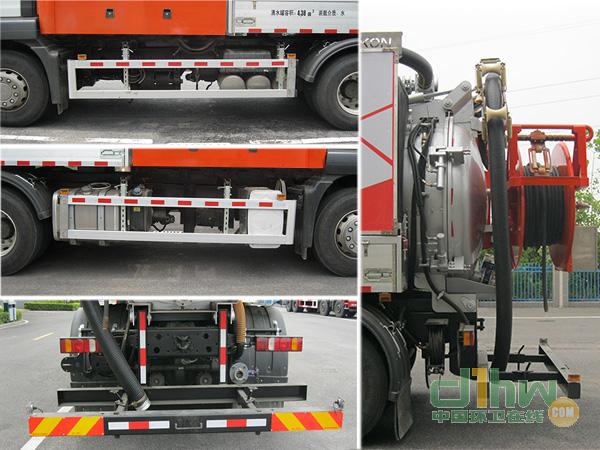 污水罐有效容積7.9立方米,罐體外形尺寸(直徑×直段長)(mm):1600×3600,選裝污水罐外形尺寸(直徑×直段長)(mm ):1700×3400,,運輸介質為液態(tài)污物,介質密度為800千克/立方米。水罐是由2個相同的梯形罐體組成,單個罐體外形尺寸(上底+下底)×高×長(mm):(767+563)×1255×2900,有效容積3.65立方米。清洗吸污兩種功能不同時使用,兩個罐體不能同時滿載。側面防護裝置材料:3A21,連接方式:橫豎桿之間螺栓連接,與車架之間螺栓連接。后下部防護裝置材料為:Q235-A,截面尺寸為:140×58(mm),僅選用軸距為4700mm和4500mm的底盤。主要專用裝置為真空抽吸及高壓清洗系統(tǒng)。隨底盤選裝駕駛室前臉擾流罩.選裝前霧燈.駕駛室頂部裝飾燈為選裝件.選裝臥鋪側窗裝飾板。選裝盤式吸污臂。