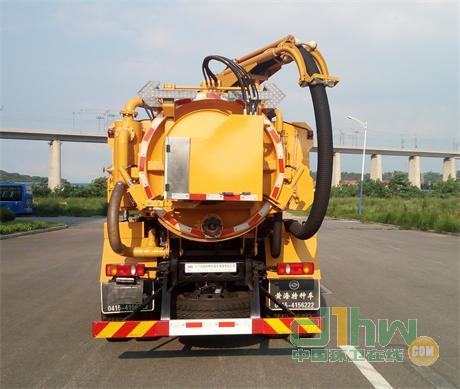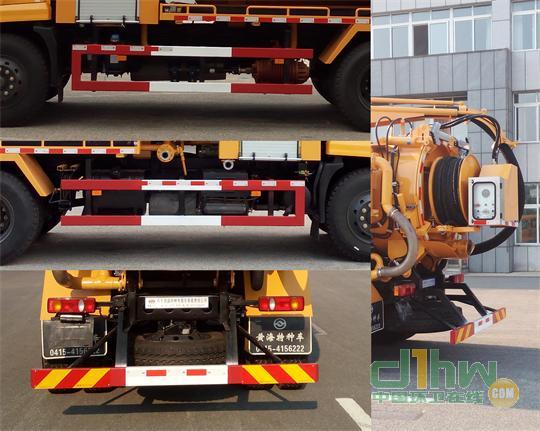該車污水罐為圓形截面,罐體外形尺寸(直徑×直段長)(mm):1420×3000,污水罐裝載介質(zhì):懸浮污物,介質(zhì)密度800千克/立方米,有效容積:4.7立方米;清水罐為對稱多邊形截面,罐體外形尺寸(長×寬×高)(mm):2800×790×1052,裝載介質(zhì):水,介質(zhì)密度1000千克/立方米,有效容積3.1立方米;污水罐和清水罐為兩個獨立的倉體,兩罐不能同時滿載;采用軸距為4200mm.側(cè)/后防護(hù)材料材質(zhì):Q235B,側(cè)/后防護(hù)采用螺栓聯(lián)接,后防護(hù)斷面尺寸50X135mm,離地高度為385mm.該車隨底盤選裝駕駛室前臉擾流罩,選裝前霧燈.選裝臥鋪側(cè)窗裝飾板,選裝排氣管前置.選裝ABS,ABS型號:3631010-C2000,4460046440;生產(chǎn)廠家:東科克諾爾商用車制動系統(tǒng)(十堰)有限公司,威伯科汽車控制系統(tǒng)(中國)有限公司.安裝具有衛(wèi)星定位系統(tǒng)行駛記錄儀.采用輪胎型號9.00R20 16PR,10.00-20(16/18PR),10.00R20(14/16/18PR),10R22.5 16PR,275/80R22.5,275/70R22.5(16/18PR),295/80R22.5.