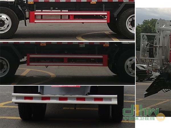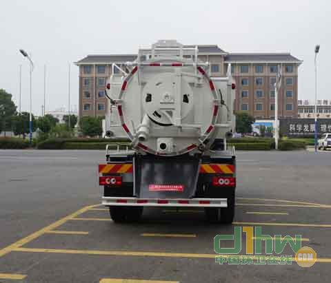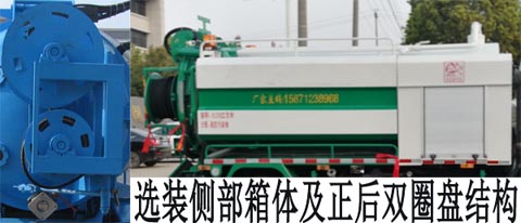 該車專用裝置為水罐和吸污罐,主要用于城市管網的清洗和疏通.吸污罐運輸介質:液態(tài)污染物,密度:800千克/立方米,載質量:4200(kg),吸污罐罐體有效容積5.51立方米.罐體尺寸(長(mm)×直徑(mm):4200×1400.清水箱運輸介質:水,密度:1000千克/立方米,載質量:900(kg),容積0.94立方米,清水箱截面為圓弧及多邊形組成,截面積為0.14平方米,清水箱外形長(mm)為:3800.兩個罐體不能同時滿載.側防護材料為Q235,連接方式為連接支架固焊在副車架大梁上.后防護材料為Q235,連接方式:用結構連接件固焊在主車后端,后部防護裝置斷面尺寸(寬×高)40×120(mm),后部防護離地高度:420(mm).選裝后部雙圈盤結構及側部結構.選裝單排帶臥鋪,選裝前圍及前部燈具.ABS型號:44600XXXX0;ABS生產企業(yè):威伯科汽車控制系統(tǒng)(中國)有限公司.安裝具有衛(wèi)星定位功能的行駛記錄儀.