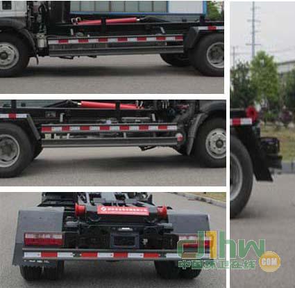 該車(chē)裝備勾臂,滾輪架和液壓油缸,用于城市垃圾的收集和轉(zhuǎn)運(yùn).隨底盤(pán)選裝新款前部燈具、前面罩及后視鏡,ABS型號(hào)為:CM4XL-4S/4K(4S/4M)和VIE ABS-II, 生產(chǎn)廠家為:廣州科密汽車(chē)電子控制技術(shù)股份有限公司和浙江萬(wàn)安科技股份有限公司;4DW93-84E5發(fā)動(dòng)機(jī)油耗值為18.36L/100km,YN27CRE1發(fā)動(dòng)機(jī)油耗值為18.41L/100km;左右側(cè)防護(hù)及后下部防護(hù)所用材料均為Q235,連接方式均為螺栓連接,后防護(hù)的斷面尺寸為130×50(mm),其離地高度為420(mm).