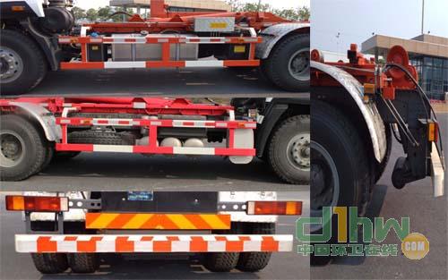 側(cè)面防護裝置材料為Q235A,后下部防護裝置材料為Q345B,后下部防護斷面尺寸為150×100mm,用螺栓連接與底盤大梁兩側(cè)連接,最大離地高度500mm.該車安裝具有衛(wèi)星定位功能的行駛記錄儀;裝配MC07.28-50發(fā)動機,對應(yīng)的油耗值均為35.5 ;裝配MC07.31-50發(fā)動機,對應(yīng)的油耗值均為35.7。ABS系統(tǒng)型號為4460046300,生產(chǎn)企業(yè)為威伯科汽車控制系統(tǒng)(中國)有限公司。軸距僅用4350+1350。