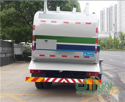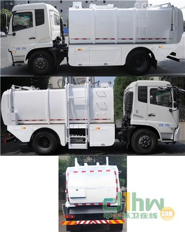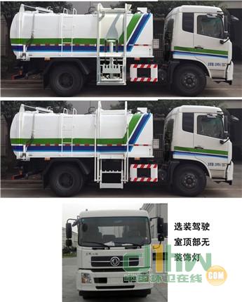 該車(chē)具有拉桿式,鏈條式2種側(cè)提桶機(jī)構(gòu).當(dāng)為拉桿式側(cè)提桶機(jī)構(gòu)時(shí),車(chē)輛高3025mm,整備質(zhì)量7300kg,額定載質(zhì)量5000kg;當(dāng)為鏈條式提桶機(jī)構(gòu)時(shí),車(chē)輛高2950mm,整備質(zhì)量7500kg,額定載質(zhì)量4800kg.該車(chē)可選裝一種裙邊結(jié)構(gòu),此時(shí)車(chē)輛整備質(zhì)量為7700kg,額定載質(zhì)量為4600kg.該車(chē)可選裝一種箱體尾部配置導(dǎo)流罩結(jié)構(gòu),此時(shí)車(chē)輛后懸為1985mm,相應(yīng)整車(chē)長(zhǎng)度為7225mm.并可選裝一種圓弧形擋泥板.ABS型號(hào):3631010-C2000,生產(chǎn)廠(chǎng)家:東科克諾爾商用車(chē)制動(dòng)系統(tǒng)(十堰)有限公司.側(cè),后防材料Q235-A,螺栓連接,后部防護(hù)裝置的斷面尺寸:120×50(mm),離地高度:510mm.該車(chē)可隨底盤(pán)選裝一種駕駛室頂部無(wú)裝飾燈具狀態(tài).