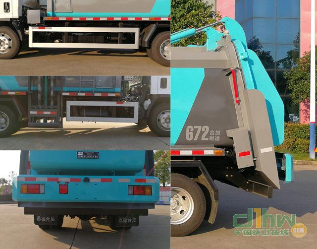 選用3815mm軸距底盤,裝有ABS,ABS及控制器型號為:APG3550500H1,生產(chǎn)廠家:浙江亞太機電股份有限公司;左側(cè)面防護裝置由防護欄組成,右側(cè)面防護裝置由防護欄及提升機構(gòu)組成,左、右側(cè)防護欄材質(zhì)為鋁合金,螺栓連接,后部防護裝置材質(zhì)為Q235A,螺栓連接,截面尺寸為(mm)150×60,離地高度為475mm.專用裝置由垃圾箱、推板機構(gòu)、提升機構(gòu)等組成,用于餐廚垃圾收集, 轉(zhuǎn)運及卸料作業(yè).