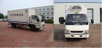 廂體頂部封閉,不可開啟.隨底盤廠家選裝駕駛室外觀.選裝其他廠家功率相當(dāng)?shù)闹评錂C(jī)組或不帶機(jī)組.選裝不同形式的側(cè)開門及側(cè)開門位置.選裝后門拉桿.選裝液壓尾板收起時(shí)水平長度為280mm.側(cè),后防護(hù)與車輛均采用螺栓連接,材料均為:Q235,后防護(hù)斷面尺寸(mm):100×60, 離地高度:400 mm. 該車為危險(xiǎn)品運(yùn)輸車,用于運(yùn)輸感染性物質(zhì),項(xiàng)號(hào)為:6.2.該車安裝ABS,限速器,前輪盤式制動(dòng),排氣管前置及具有衛(wèi)星定位功能的行駛記錄儀,僅選用底盤選裝的子午線輪胎。ABS系統(tǒng)型號(hào):APG3550500A,ABS系統(tǒng)生產(chǎn)廠家:浙江亞太機(jī)電股份有限公司。采用JX493ZLQ5型、JX493ZLQ5A發(fā)動(dòng)機(jī)對(duì)應(yīng)的油耗值均為11.9L/100km.
