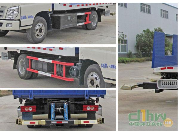 隨底盤選裝駕駛室,選裝擺臂平板裝置、后平板、后托臂、后欄板、后部伸縮機構(gòu);托舉質(zhì)量:660kg;側(cè)防護裝置材料:Q235,連接方式:螺栓連接,離地高度:450mm;由于車輛結(jié)構(gòu)特殊,無需安裝后下部防護裝置,離地高度:450mm。ABS控制器的型號,ABS-E,APG3550500A,生產(chǎn)企業(yè)為:威伯科汽車控制系統(tǒng)(中國)有限公司,浙江亞太機電股份有限公司。