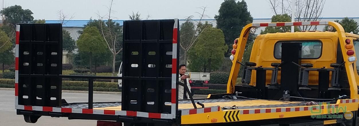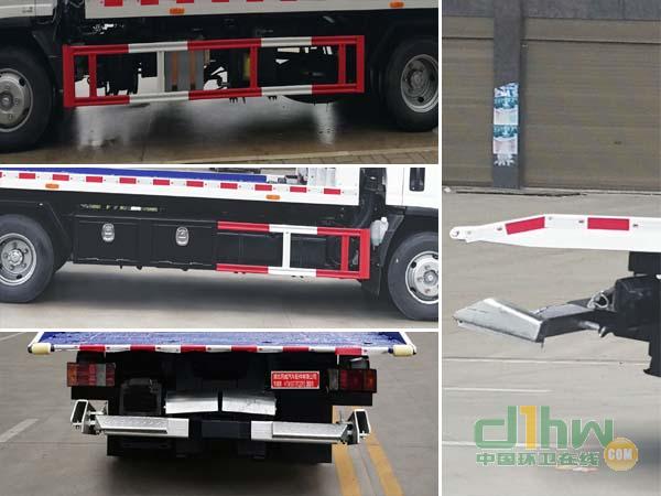 托舉質量:2605kg。側防護材料采用Q235,螺栓連接。后防護由專用裝置替代,下邊緣離地高450mm。ABS及其控制器型號為:APG3550500A4/CM4XL-4S/4M,生產廠家為:浙江亞太機電股份有限公司/廣州瑞立科密汽車電子股份有限公司。選裝尾部站板。該車主要裝置為托舉平板,用于清除道路障礙。