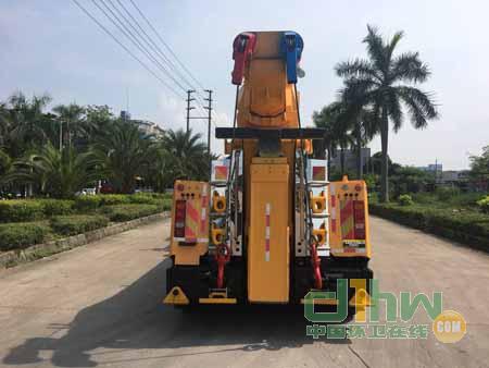 裝60DZ2+26TH1+40ZTX上裝,吊機(jī)自重:11000kg。托舉質(zhì)量18270kg。兩側(cè)為裙板結(jié)構(gòu)防護(hù),下緣離地高度250mm。后部為專用托舉裝置替代后防護(hù),離地高度495mm。底盤僅采用軸距(mm):1950+3625+1375+1350。ABS系統(tǒng)型號:4460046300,生產(chǎn)企業(yè):威伯科汽車控制系統(tǒng)(中國)有限公司。