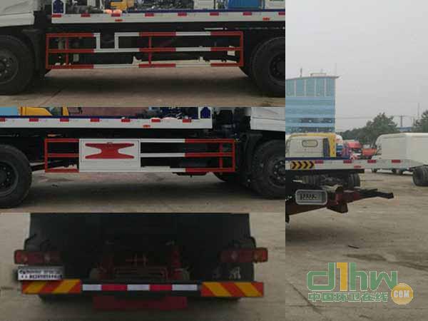 此車用于道路清障,專用裝置為托舉臂。整備質(zhì)量8000kg時托舉質(zhì)量為4300kg,整備質(zhì)量8300kg時托舉質(zhì)量為4000kg。外形尺寸/軸距一一對應(yīng):9150/4700,9450/5000;隨底盤選裝駕駛,選裝加強型結(jié)構(gòu),選裝擺臂平板,后欄板。選裝整車寬度2480mm。側(cè)面防護裝置材料材質(zhì):Q235,螺栓連接;后防護由專用裝置替代,下邊緣離地高450mm。ABS型號:3631010-C2000,生產(chǎn)廠家:東科克諾爾商用車制動系統(tǒng)(十堰)有限公司。