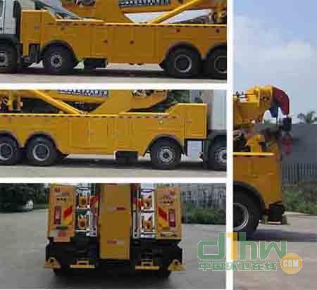 上裝為60DZ2+26TH1+60ZTX,60DZ2吊機(jī)自重11000kg,托舉質(zhì)量8670kg。整車兩側(cè)為Q235鋼質(zhì)工具箱裙板防護(hù),后部為專用托舉裝置替代后防護(hù),后托舉裝置下緣離地高度為495mm。ABS型號:EBS7 ECU,ABS生產(chǎn)廠家:KNORR。