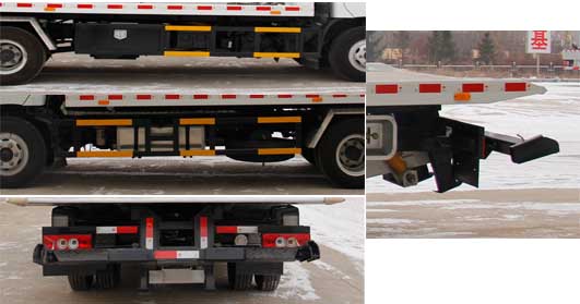 1,后伸:240mm.托舉質(zhì)量2865kg;2,側(cè)防護(hù)材料Q235A,螺栓連接.后防護(hù)為清障車專用裝置,與后部防護(hù)相干涉,故未安裝后部防護(hù),后專用裝置離地為540mm;3,ABS,廠家:威伯科汽車控制系統(tǒng)(中國(guó))有限公司,型號(hào):44600XXXX0; 隨底盤選裝前圍; 可選裝拉臂結(jié)構(gòu)平板及尾板時(shí)整備質(zhì)量為5640kg,托舉質(zhì)量為2445kg.選裝無(wú)托具結(jié)構(gòu)時(shí),整備質(zhì)量為4750kg,托舉質(zhì)量為3335kg,長(zhǎng)為7330mm;4,采用3800軸距底盤.