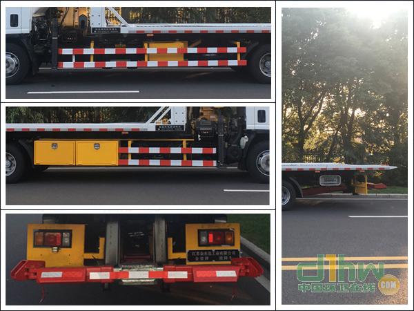 托舉質(zhì)量:2050kg;該車裝SQ4ZK2折臂式吊機(jī),吊機(jī)自重1200kg,最大起升載荷4000kg;側(cè)防護(hù)與底盤縱梁間采用螺栓連接,材質(zhì)為Q235A;后部是清障車專用裝置替代后防護(hù),離地高度540mm。ABS及控制器型號(hào)為:APG3550500H1,生產(chǎn)廠家為:浙江亞太機(jī)電股份有限公司;發(fā)動(dòng)機(jī)凈功率為140kw。該車是采用已上公告的五十鈴牌QL1100A8PAY型載貨汽車底盤改裝而成的新產(chǎn)品,其專用裝置主要由平板、托臂、絞盤、吊機(jī)及液壓控制裝置等組成,并能安全、無(wú)損傷地清理、裝運(yùn)故障、事故、違章的車輛。