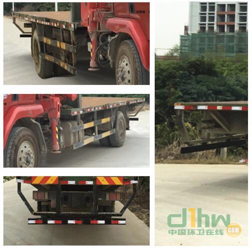 1.本車(chē)型已安裝側(cè)面和后部反光標(biāo)識(shí);2.托舉裝置型號(hào)為SQ6.3Z,SQ240,BS330,BS400,自重3850kg,最大起升載荷為4995kg;托舉質(zhì)量為4995kg;3.隨底盤(pán)選裝駕駛室;4.防護(hù)材料均為Q235,側(cè)防護(hù)采用螺栓連接,后部防護(hù)裝置與車(chē)架采用焊接方式連接,斷面尺寸為100mm×50mm,離地高度為550mm;5.該車(chē)安裝帶有衛(wèi)星定位功能的行駛記錄儀,安裝ABS,ABS型號(hào)/企業(yè):ABS-E 4S/4M/威伯科汽車(chē)控制系統(tǒng)有限公司.該車(chē)僅用5700mm軸距.