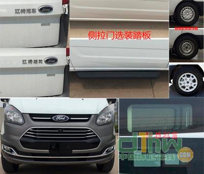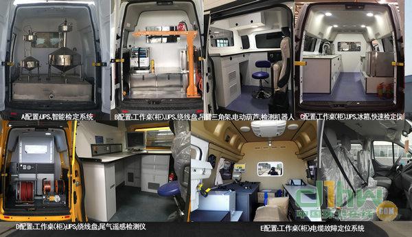 隨底盤選裝側(cè)拉門、普通前大燈。選裝發(fā)電機(jī)及發(fā)電機(jī)艙門。選裝車頂前額位置凸臺,車頂可單獨(dú)或部分選裝設(shè)備平臺、換氣扇、空調(diào)、升降照明燈、場地照明燈、氣象儀。不裝發(fā)電機(jī)及蓄電池時(shí),整備質(zhì)量為3450kg。不裝車頂設(shè)備高2595mm,選裝車頂設(shè)備平臺高2800mm,選裝車載空調(diào)高2960mm,選裝升降照明燈(帶攝像頭)高3130mm,選裝升降照明燈(無攝像頭)高3015mm,選裝氣象儀高3490mm。后側(cè)窗及尾門窗可全部或部分選裝盲窗,選裝尾門左側(cè)或右側(cè)位置爬梯。車身一側(cè)或兩側(cè)選裝玻璃上掀窗或盲窗上掀窗,車頂一側(cè)或兩側(cè)選裝遮陽蓬。裝備檢測工作桌、供電系統(tǒng)、檢測設(shè)備等專用裝置