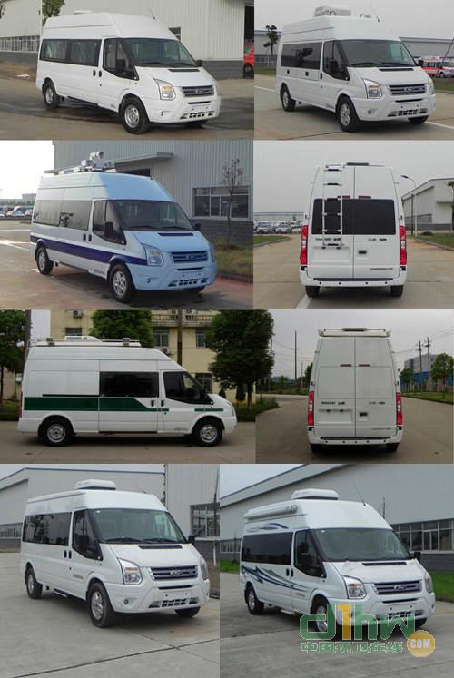 隨底盤選裝側拉門、普通前大燈。選裝發(fā)電機及發(fā)電機艙門。選裝車頂前額位置凸臺,車頂可單獨或部分選裝設備平臺、換氣扇、空調、升降照明燈、場地照明燈、氣象儀。不裝發(fā)電機及蓄電池時,整備質量為3450kg。不裝車頂設備高2595mm,選裝車頂設備平臺高2800mm,選裝車載空調高2960mm,選裝升降照明燈(帶攝像頭)高3130mm,選裝升降照明燈(無攝像頭)高3015mm,選裝氣象儀高3490mm。后側窗及尾門窗可全部或部分選裝盲窗,選裝尾門左側或右側位置爬梯。車身一側或兩側選裝玻璃上掀窗或盲窗上掀窗,車頂一側或兩側選裝遮陽蓬。裝備檢測工作桌、供電系統(tǒng)、檢測設備等專用裝置。