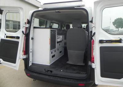 隨底盤選裝側拉門、普通前大燈。選裝發(fā)電機及發(fā)電機艙門。選裝車頂前額位置凸臺,車頂可單獨或部分選裝設備平臺、換氣扇、空調、升降照明燈、場地照明燈、氣象儀。不裝發(fā)電機及蓄電池時,整備質量為3450kg。不裝車頂設備高2595mm,選裝車頂設備平臺高2800mm,選裝車載空調高2960mm,選裝升降照明燈(帶攝像頭)高3130mm,選裝升降照明燈(無攝像頭)高3015mm,選裝氣象儀高3490mm。后側窗及尾門窗可全部或部分選裝盲窗,選裝尾門左側或右側位置爬梯。車身一側或兩側選裝玻璃上掀窗或盲窗上掀窗,車頂一側或兩側選裝遮陽蓬。裝備檢測工作桌、供電系統(tǒng)、檢測設備等專用裝置。