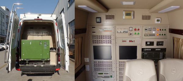 車內(nèi)設(shè)置工作臺,設(shè)備柜及相關(guān)檢測設(shè)備,配置檢測控制,電源控制等系統(tǒng),主要用于現(xiàn)場檢測檢驗,氣象環(huán)保監(jiān)測等使用。車頂選裝工作平臺,防護圍欄及場地照明燈,選裝頂置空調(diào),升降照明設(shè)備,風(fēng)廓線雷達,衛(wèi)星天線,遮陽篷,監(jiān)視器及攝像云臺,喇叭等