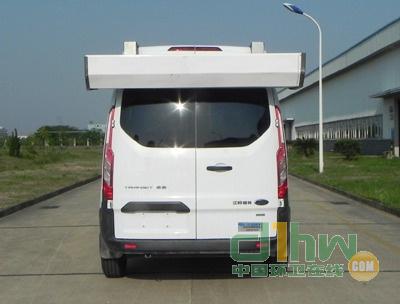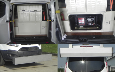 隨底盤選裝側(cè)拉門、普通前大燈。選裝發(fā)電機(jī)及發(fā)電機(jī)艙門。選裝車頂前額位置凸臺,車頂可單獨或部分選裝設(shè)備平臺、換氣扇、空調(diào)、升降照明燈、場地照明燈、氣象儀。不裝發(fā)電機(jī)及蓄電池時,整備質(zhì)量為3450kg。不裝車頂設(shè)備高2595mm,選裝車頂設(shè)備平臺高2800mm,選裝車載空調(diào)高2960mm,選裝升降照明燈(帶攝像頭)高3130mm,選裝升降照明燈(無攝像頭)高3015mm,選裝氣象儀高3490mm。后側(cè)窗及尾門窗可全部或部分選裝盲窗,選裝尾門左側(cè)或右側(cè)位置爬梯。車身一側(cè)或兩側(cè)選裝玻璃上掀窗或盲窗上掀窗,車頂一側(cè)或兩側(cè)選裝遮陽蓬。裝備檢測工作桌、供電系統(tǒng)、檢測設(shè)備等專用裝置。
