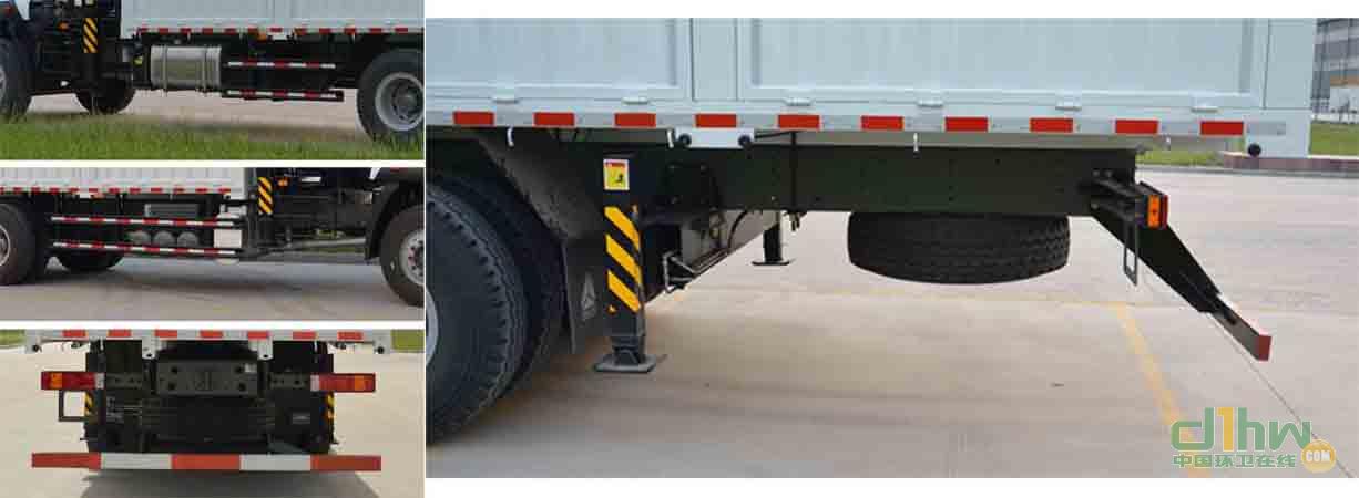 僅選用5700+1350mm軸距底盤??蛇x裝貨箱欄板結(jié)構(gòu)。選裝高空座椅操作形式,選裝在隨車起重機(jī)轉(zhuǎn)臺(tái)布置液壓油箱形式,高空座椅和液壓油箱引起的質(zhì)量變化在3%以內(nèi)。駕駛室準(zhǔn)乘人數(shù)與額定載質(zhì)量參數(shù)一一對應(yīng)。隨車起重機(jī)型號(hào)/質(zhì)量(kg)/最大起升載荷(kg)/整備質(zhì)量(kg)/額定載質(zhì)量(kg)/整車高度(mm)/貨廂欄板內(nèi)尺寸長(mm)對應(yīng)關(guān)系為:ST220/4080/8000/15300/9570(2人),9505(3人)/3600/8360;ST170/2450/6300/13910/10960(2人),10895(3人)/3400/8600。選裝MC07.28-50發(fā)動(dòng)機(jī)時(shí)油耗申報(bào)值為35.5L/100km,選裝MC07.31-50發(fā)動(dòng)機(jī)時(shí)油耗申報(bào)值為35.7L/100km。側(cè)面及后下部防護(hù)裝置所用材料材質(zhì)為Q235A,連接方式為螺栓連接,后下部防護(hù)裝置的斷面尺寸為100mm×50mm,離地高度510mm。ABS系統(tǒng)型號(hào)為4460046300,生產(chǎn)企業(yè)為威伯科汽車控制系統(tǒng)(中國)有限公司。安裝具有衛(wèi)星定位功能的行駛記錄儀。