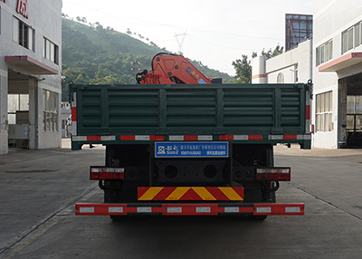 起重機(jī)型號(hào)選裝SQ320、SQ400,最大起升載荷為10800Kg,質(zhì)量為7800Kg;SQ460、SQ500、SQ600最大起升載荷為11200Kg,質(zhì)量為8800Kg;左,右及后下部防護(hù)裝置所用材料為Q235-A。左右防護(hù)和后防護(hù)裝置與底盤是采用螺栓連接;后防護(hù)裝置斷截面尺寸為50mm×120mm,離地高度為500mm;該車安裝具有衛(wèi)星定位功能的行駛記錄儀,選裝貨廂結(jié)構(gòu)、吊臂結(jié)構(gòu)形式和支腿安裝方式;ABS控制器型號(hào)/生產(chǎn)企業(yè):VIE ABS-II/浙江萬安科技股份有限公司,CM4XL-4S/4M/廣州科密汽車電子控制技術(shù)股份有限公司;發(fā)動(dòng)機(jī)WP10.310E53的油耗申報(bào)值(L/100km)為40.8。