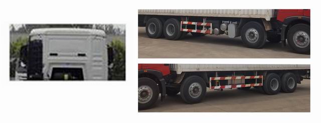 僅選用1950+4450+1350mm和1950+4425+1400mm軸距底盤。僅選用11/11/10,3/3/10,3/3/5,3/3/4懸架的底盤。選裝無后風(fēng)窗。后懸與軸距參數(shù)一一對應(yīng)。駕駛室準乘人數(shù)與整備質(zhì)量參數(shù)一一對應(yīng)。選裝MC07.28-52、MC07.31-52和MC07.34-52發(fā)動機時,消聲器等部件布置在車架右側(cè),二三軸之間;排氣口位置為車架左側(cè),朝左。隨車起重機型號/吊機質(zhì)量(kg)/最大額定起升載荷(kg)為:X-CL12/1330/3350。選裝MC07.28-50和MC07.28-52發(fā)動機時,油耗申報值為39.1L/100km;選裝MC07.31-50和MC07.31-52發(fā)動機時,油耗申報值為39.2L/100km;選裝MC07.34-50和MC07.34-52發(fā)動機時,油耗申報值為39.4L/100km;選裝MC07.35-50發(fā)動機時,油耗申報值為39.5L/100km。側(cè)面防護裝置所用材料材質(zhì)為Q235A,連接方式為螺栓連接;后部防護裝置所用材料材質(zhì)為Q235A,連接方式為螺栓連接,斷面尺寸為100mm×50mm,離地高度為500mm。ABS系統(tǒng)型號為4460046300,生產(chǎn)企業(yè)為威伯科汽車控制系統(tǒng)(中國)有限公司。安裝帶衛(wèi)星定位功能的行駛記錄儀。