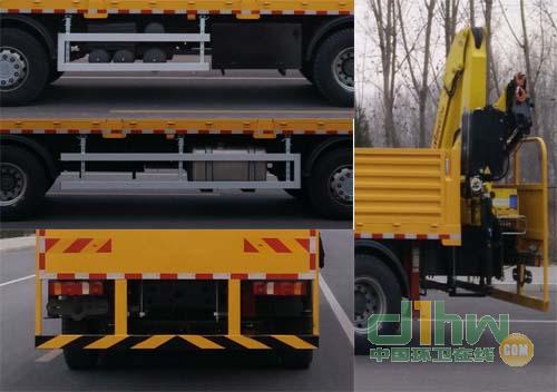 隨底盤選裝駕駛室,該車側(cè)防護裝置所用材料為鋁材質(zhì),與車架螺栓連接。后下部防護裝置所用材料為Q235,與車架焊接固定,截面尺寸為:120×60×2400(mm),離地高480mm。選裝起重機型號,最大起重載荷,自重分別為:PK(SPK)25500,6600kg,2550kg;PK(SPK)23500,6900kg,2600kg;PK(SPK)23080,6900kg,2600kg;PK(SPK)23080,6900kg,2600kg;HIAB178,6600kg,2350kg;HIAB244,6800kg,2450kg;HIAB288,7100kg,2450kg;HB150,6900kg,2450kg;HB250,7100kg,2650kg;SQZ(QYS)10,7000kg,2700kg;SQZ(QYS)12,7000kg,2700kg;F155,7500kg,2450kg;F245,6900kg,2600kg;F275,6900kg,2600kgg;F315,6900kg,2600kg。ABS系統(tǒng)型號為4460046300,生產(chǎn)企業(yè)為威伯科汽車控制系統(tǒng)(中國)有限公司。軸距為1950+4600+1400時總長為12000;軸距為1950+4625+1350時總長為11975.