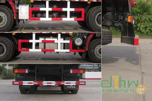 該車為油田作業(yè)車,由三缸柱塞泵、供液箱等組成,主要用于油田洗井、試壓等作業(yè)。隨底盤選裝駕駛室準(zhǔn)乘人數(shù)2人或3人時,總質(zhì)量分別為16400千克和16465千克。并隨底盤選裝同系列駕駛室、前面罩、遮陽罩??蛇x裝983D,TM1200-1,DMCT1000三種反光標(biāo)識和選裝DA-32a、DA-32b和VCDM-3兩種后尾部標(biāo)志板,選裝時固定位置相同,對外形無影響。僅用軸距(mm):4375+1400。側(cè)面及后下部防護裝置材質(zhì)為Q235A,均為螺栓連接,后下部防護截面為矩形,截面尺寸(mm):120×80,離地高度(mm):500。ABS裝置生產(chǎn)型號及廠家:西安正昌電子有限責(zé)任公司(型號:ZQFB-V),廣州市科密汽車制動技術(shù)開發(fā)有限公司(型號:CM4XL-4S/4K),浙江萬安科技股份有限公司(型號:VIE ABS-Ⅱ)。
