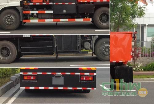 該車為瀝青路面養(yǎng)護(hù)專用作業(yè)車,前部懸掛安裝有壓路機(jī),前伸830mm,整車總長(zhǎng)8800mm,整備質(zhì)量為12900kg。選裝前部無(wú)懸掛安裝壓路機(jī),整車總長(zhǎng)7720mm,整備質(zhì)量以12100kg。側(cè)防裝置材料為Q235A,與汽車大梁用螺栓連接。后防護(hù)為l車身結(jié)構(gòu)代替,與車身焊接為一個(gè)整體,材料Q235A,后部離地高320mm。 該車僅選用軸距4500mm底盤。隨底盤裝備ABS系統(tǒng),ABS生產(chǎn)廠家:東風(fēng)電子科技股份有限公司制動(dòng)系統(tǒng)公司,型號(hào):3631010-C2000。隨底盤駕駛室選裝前霧燈,駕駛室頂部裝飾燈為選裝件。