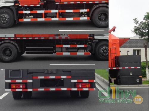 該車為瀝青路面養(yǎng)護(hù)專用作業(yè)車,前部懸掛安裝有壓路機(jī),前伸830mm,整車總長9750mm,整備質(zhì)量為14650kg,選裝前部無懸掛安裝壓路機(jī),整車總長 8660mm,整備質(zhì)量為13895kg,側(cè)防裝置材料為Q235A,與汽車大梁用螺栓連接.后防護(hù)為車身結(jié)構(gòu)代替,與車身焊接為一個(gè)整體,材料Q235A,后部離地高435mm,僅選用5000軸距。 隨底盤裝備ABS系統(tǒng),ABS生產(chǎn)廠家:東風(fēng)電子科技股份有限公司制動(dòng)系統(tǒng)公司,型號(hào):3631010-C2000。隨底盤駕駛室選裝前霧燈,駕駛室頂部裝飾燈為選裝件。