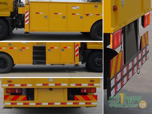 車長(zhǎng)9890mm,前伸695mm,后伸375mm;車長(zhǎng)9580mm,前伸695mm,后伸65mm。隨底盤選裝前霧燈,選裝臥鋪側(cè)窗裝飾板,駕駛室頂部裝飾燈為選裝件,選裝駕駛室。選裝左側(cè)支腿前擋板。ABS型號(hào):3631010-C2000,4460046440;生產(chǎn)廠家:東科克諾爾商用車制動(dòng)系統(tǒng)(十堰)有限公司,威伯科汽車控制系統(tǒng)(中國(guó))有限公司。側(cè)防護(hù)為裙板式結(jié)構(gòu),材料Q235鋼,采用焊接連接。后防護(hù)與副車架采用螺栓連接,材質(zhì)為Q235鋼,斷面尺寸150mm×60mm,下緣離地高度500mm。