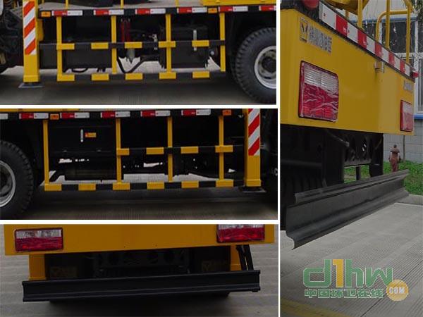 裝配GKS20上裝,整備質(zhì)量7705kg,車長7440mm,后懸2000mm,后伸515mm,離去角13°;裝配GKS21上裝,整備質(zhì)量7855kg,車長7940mm,后懸2250mm,后伸765mm,離去角12°。安裝ABS,ABS型號及廠家是ABS 8,克諾爾制動設(shè)備(上海)有限公司。側(cè)防護(hù)材料Q235鋼,與車架采用螺栓連接;后防護(hù)材質(zhì)為Q235鋼,斷面尺寸140mmX50mm,下緣離地高度440mm。
