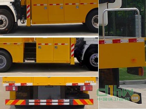 后伸215mm.底盤僅采用4500mm軸距.隨底盤選裝保險杠,選裝前面罩,選裝后視鏡。ABS系統(tǒng)型號為XH-KQ4S4M-E01,生產(chǎn)企業(yè)為廣州市西合汽車電子裝備有限公司。側(cè)防護為裙板式結(jié)構(gòu),材料Q235鋼,采用焊接連接。后防護與副車架采用螺栓連接,材質(zhì)為Q235鋼,斷面尺寸150mm×60mm,下緣離地高度500mm。該車型裝備含有支腿、轉(zhuǎn)臺、臂架、工作平臺等部件的高空作業(yè)裝置,可將作業(yè)人員與工具送到指定高度位置進行作業(yè)。