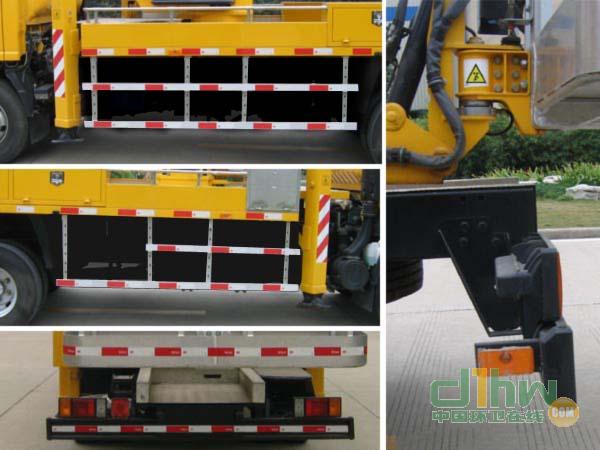 后伸515mm。本車型專用功能為通過臂架折疊伸縮,轉(zhuǎn)臺回轉(zhuǎn),將工作平臺舉升至作業(yè)位置。專用裝置主要包括臂架,轉(zhuǎn)臺,工作平臺,支腿等。ABS及控制器型號為:APG3550500H1,生產(chǎn)廠家為:浙江亞太機(jī)電股份有限公司。側(cè)防護(hù)材質(zhì)為6063鋁,連接方式為螺栓連接,后防護(hù)材質(zhì)為Q235鋼,后防護(hù)斷面尺寸為140mm×50mm,后防護(hù)離地高度440mm。