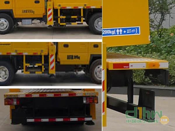 前伸165mm。選裝封閉式作業(yè)平臺。 選裝兩側前支腿罩殼造型。不選裝起重裝置時整備質量為5375kg。該車型裝備含有支腿、轉臺、臂架、工作平臺等部件的高空作業(yè)裝置,可將作業(yè)人員與工具送到指定高度位置進行作業(yè)。ABS及其控制器型號為:APG3550500A4,生產(chǎn)廠家為:浙江亞太機電股份有限公司。側、后防護材質為Q235鋼,連接方式為螺栓連接,后部防護裝置的截面尺寸為120mm×60mm,下緣離地高度為420mm。