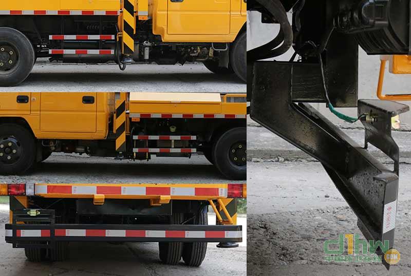 1、專用裝置后伸:790mm。2.吊鉤為選裝,選裝吊鉤時最大總質(zhì)量為5880kg,整備質(zhì)量為5555kg,吊鉤最大起吊重量為1000kg。3、側(cè)防護(hù)所用材料材質(zhì)為Q235,連接方式為螺栓連接;后下部防護(hù)裝置材料:WL510,斷面尺寸130mm×30 mm,離地高度:380mm。4、ABS型號:APG3550500A,生產(chǎn)廠:浙江亞太機(jī)電股份有限公司。5、隨底盤選裝前照燈,前霧燈,前位燈,前轉(zhuǎn)向燈,前臉,前保險杠。