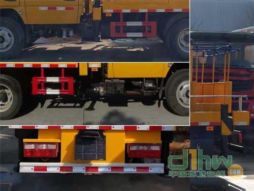 該車用途為搶修電力、通訊、路燈等高空作業(yè)。主要裝置為升降平臺(tái),作業(yè)臂。當(dāng)外形尺寸為7650mm時(shí)前伸780mm,后伸400mm,后懸:2122mm; 當(dāng)外形尺寸為6850mm時(shí)前伸400mm.后懸:2102mm;選裝不帶吊鉤結(jié)構(gòu),隨底盤選裝駕駛室。側(cè)、后防護(hù)采用碳鋼/Q235,焊接連接。后防護(hù)截面尺寸(寬×高) (mm):100×50,離地高390mm;僅采用3308mm軸距底盤.ABS廠家及型號(hào):襄陽(yáng)東風(fēng)隆誠(chéng)機(jī)械有限責(zé)任公司/ABS/ASR-24V-4S/4M。