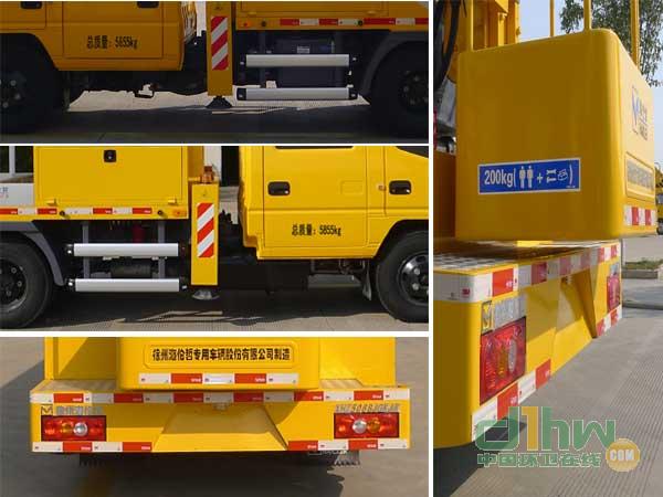 選裝GKZ16G時車長7400mm,后懸2170mm,前伸:435mm,后伸:370mm,車高2860mm,整備質(zhì)量5650kg;選裝GKZ17F時車長7660mm,后懸2095mm,前伸:640mm,后伸:500mm,車高2995mm,整備質(zhì)量5510kg;選裝GKZ17F無起重裝置時整備質(zhì)量為5290kg。選裝封閉式工作平臺。隨底盤選裝前照燈,前霧燈,前位燈,前轉(zhuǎn)向燈,前臉,前保險杠;選裝組合尾燈,選裝后視鏡,不選裝門框下邊框黑色貼膜。選裝鋁合金或鋼制側(cè)防護。選裝造型外觀。選裝底盤油箱、尿素罐、液壓油箱位置。選裝兩側(cè)前支腿罩殼造型。ABS系統(tǒng)型號:APG3550500A,ABS系統(tǒng)生產(chǎn)廠家:浙江亞太機電股份有限公司。側(cè)防護材料6063鋁,采用螺栓連接;選裝側(cè)防護材料Q235鋼,采用螺栓連接;后下部防護為裙板式結(jié)構,材料Q235鋼,下緣離地高度420mm。