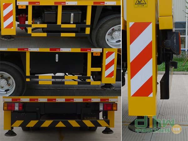 選裝封閉式作業(yè)平臺(tái);選裝起重裝置:整備質(zhì)量5170kg,車長7170mm,前伸655mm;不選裝起重裝置:整備質(zhì)量4880kg,車長7010mm,前伸495mm。后伸140mm。ABS及其控制器型號(hào)為:APG3550500A4,生產(chǎn)廠家為:浙江亞太機(jī)電股份有限公司。側(cè)、后防護(hù)材質(zhì)為Q235鋼,連接方式為螺栓連接,后部防護(hù)裝置的截面尺寸為120mm×60mm,下緣離地高度為420mm。
