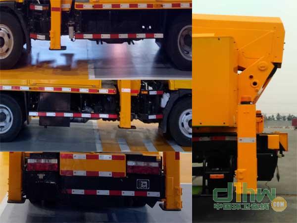 當整車長8600mm時,前伸200mm,后伸1120mm;當整車長8420mm時,前伸960mmm,后伸180mm;當整車長7680mm時,前伸400mm.選裝無吊鉤裝置和密封吊籃。側面防護及后下部防護裝置材料:碳鋼/Q235B,側面防護連接方式:螺栓加焊接連接,后下部防護連接方式:螺栓加焊接連接,斷面尺寸(寬×高):50×120(mm),離地高度:450mm.ABS及其控制器型號為:APG3550500A4,生產(chǎn)廠家為:浙江亞太機電股份有限公司。