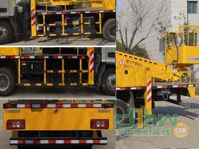 后伸640mm。該車型裝備含有支腿,轉(zhuǎn)臺,臂架,工作平臺等部件的高空作業(yè)裝置,可將作業(yè)人員與工具送到指定高度位置進行作業(yè)。安裝ABS,ABS系統(tǒng)型號:ABS-E,ABS系統(tǒng)生產(chǎn)廠家:威伯科汽車控制系統(tǒng)(中國)有限公司。側(cè)防護材質(zhì)為Q235A鋼,連接方式為螺栓連接,后下部防護為底盤自帶后防護,材質(zhì)為矩形管Q345A,為螺栓連接,后下部防護裝置截面尺寸100mm×50mm,下緣離地高度400mm。