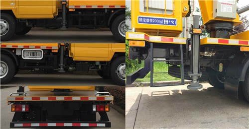 該車具有前伸為30mm,后伸為95mm.該車具有配置起吊裝置和無起吊裝置兩種狀態(tài),其中配置起吊裝置時整車整備質(zhì)量為5095kg,無起吊裝置時整車整備質(zhì)量為4945kg.該底盤裝ABS,ABS及其控制器型號為:APG3550500A4,生產(chǎn)廠家為:浙江亞太機電股份有限公司.該車隨底盤裝4KH1CN5HS型發(fā)動機時,車輛的最高車速為110km/h; 該車隨底盤裝4KH1-TCG51型發(fā)動機時,車輛的最高車速為105km/h,且不裝尿素罐和排氣管后端(尿素催化還原裝置).側(cè)、后防材料:Q235,連接方式:螺栓連接, 后部防護(hù)裝置的截面尺寸:100×50(mm), 下緣離地高度:460mm. 該車裝備有起重舉升裝置,具有將人員和物具舉升到一定作業(yè)高度的專用功能。